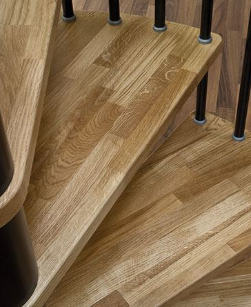 Ступени лестницы выполнены из массива бука, покрыты бесцветным лаком. Металлические элементы доступны в чёрном или серебристом цвете (порошковая покраска)