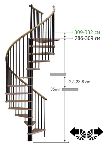 Лестница представлена в двух вариантах: с поворотом направо и с поворотом налево. Благодаря возможности регулировать высоту шага с помощью пластиковых вставок (входят в базовый комплект), высоту лестницы можно варьировать в пределах от 2860 до 3090 мм. Кроме того, купив дополнительную секцию для этой лестницы, можно поднять высоту до 3320 мм.