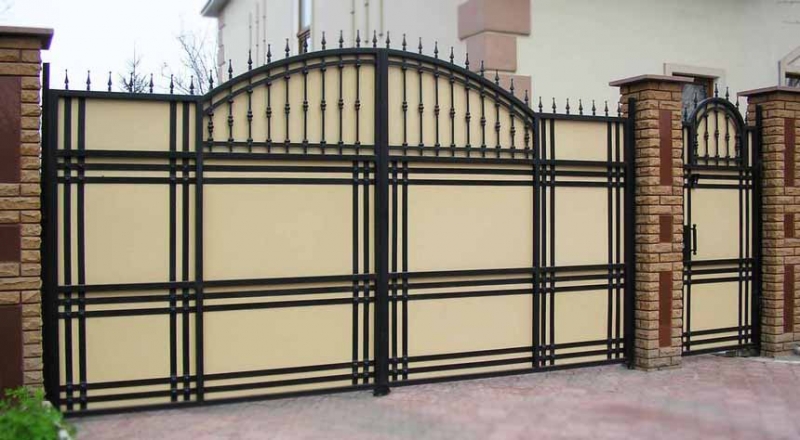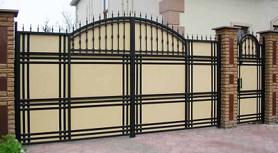 Классические кованые ворота зашитые металлом, что обеспечивает надежность и защищенность от посторонних глаз. Светлый оттенок обшивки придает кованым элементам особую привлекательность.   Специально для Вас мы готовы предложить индивидуальный подбор дизайна, огромный выбор материалов, роскошную палитру цветов и типов красок, патинирование, декорирование под старину.