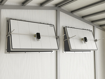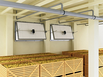 Изделие применяется для создания автоматизированной системы вентиляции больших помещений для хранения овощей. Продукт будет способствовать снижению затрат собственников за счет использования в холодное время года уличного воздуха для вентиляции. Алюминиевые рама и каркас изделия предназначены для работы в условиях агрессивных сред.